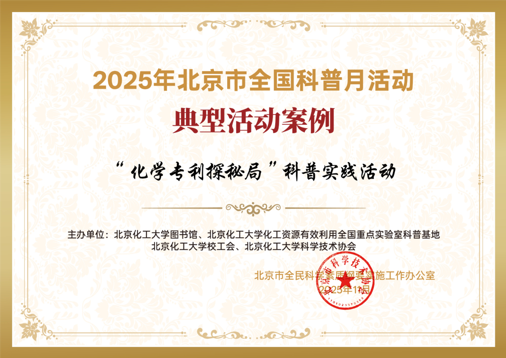 近日,在北京市全民科学素质纲要实施工作办公室主办的“2025年北京市全国科普月暨第十五届北京科学嘉年华展示交流活动”中,由北京化工大学图书馆、北京化工大学化工资源有效利用全国重点实验室科普基地、北京化工大学校工会、北京化工大学科学技术协会联合策划组织的青少年跨学科科普活动——“化学专利探秘局”,成功入选“2025年北京市全国科普月典型活动案例”。该活动以其创新的理念与模式,从全市数千场科普活动中脱颖而出,成为我校依托学科特色服务社会、创新科普工作的重要成果。