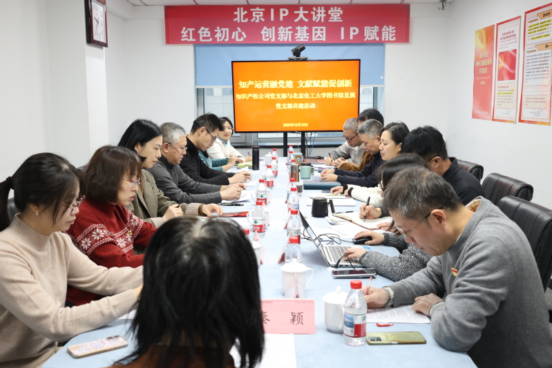 为深入学习贯彻党的二十届四中全会精神,推动党建与业务深度融合,搭建校企资源共享、优势互补的合作桥梁,12月18日上午,北京化工大学图书馆直属党支部与北京知识产权运营管理有限公司(以下简称“知识产权公司”)党支部共建活动在中关村知识产权大厦顺利举行。双方党员代表齐聚一堂,以党建为引领,围绕知识产权服务、人才培养、成果转化等核心议题展开深入交流,共绘协同发展新蓝图。图书馆直属党支部书记王玉、副书记王永生、副馆长李莎和参考咨询部党员教师代表参加了活动。